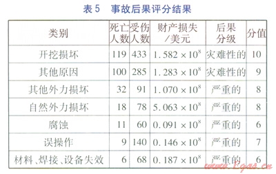 不同類型風險因素導致的事故類型也不相同,使得管道事故造成的后果差異也較大。例如,開挖損壞一般對管道破壞較大,會導致氣體大量泄漏,產(chǎn)生火災爆炸的可能性較大;而腐蝕類型風險一般是腐蝕穿孔,泄漏孑L徑較小,產(chǎn)生的后果也較小。