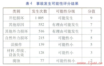 根據(jù)表1、圖1、2中的統(tǒng)計數(shù)據(jù),按照表2、3中制定的準則進行評分,通過式(1)計算城市燃氣管道風險因素等級。事故發(fā)生可能性評分結(jié)果見表4,事故后果評分結(jié)果見表5。