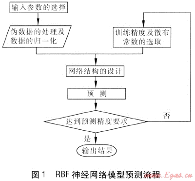 RBF網(wǎng)絡和普通的前向網(wǎng)絡有所不同,隱層神經(jīng)元是徑向基神經(jīng)元而不是tansig或者logsig神經(jīng)元。普通前向網(wǎng)絡中sigmoid神經(jīng)元能夠覆蓋較大的輸入?yún)^(qū)域,但是普通前向神經(jīng)元數(shù)目在訓練前就已經(jīng)固定下來。而徑向基神經(jīng)元雖然只對相對較小的區(qū)域產(chǎn)生響應,但是在輸入?yún)^(qū)間較大時,可以適當?shù)卦黾訌较蚧窠?jīng)元來調(diào)整網(wǎng)絡,從而達到精度要求。且RBF網(wǎng)絡的設計比普通前向網(wǎng)絡訓練要省時得多[6]。RBF網(wǎng)絡模型預測流程見圖1。