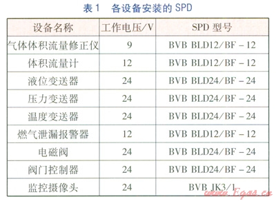 ①利用SPD將設(shè)備各端口的對地電位限制在設(shè)備能承受的范圍內(nèi),同時將各端口的感應(yīng)過電壓、過電流泄放到地,實現(xiàn)對設(shè)備的保護。安裝在室外的設(shè)備在各進出線端安裝SPD,SPD需安裝于防水防爆屏蔽箱內(nèi)。該措施解決了上述隱患①~⑥。具體各設(shè)備安裝的SPD見表1。