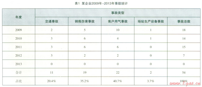 搞好安全管理的前提是進(jìn)行風(fēng)險(xiǎn)分析。根據(jù)企業(yè)的具體特點(diǎn),對(duì)全企業(yè)進(jìn)行全面而系統(tǒng)的安全風(fēng)險(xiǎn)分析,按照現(xiàn)代系統(tǒng)安全工程的觀點(diǎn),安全生產(chǎn)工作是為了使生產(chǎn)過(guò)程符合物質(zhì)條件和工作秩序,防止發(fā)生人身傷亡和財(cái)產(chǎn)損失的活動(dòng),安全牛產(chǎn)工作的主要目標(biāo)是使系統(tǒng)中的人員免遭不可承受風(fēng)險(xiǎn)的傷害。安全管理工作實(shí)際上就是風(fēng)險(xiǎn)管理工作。各崗位的危險(xiǎn)程度用危險(xiǎn)度來(lái)表示,它是由事故發(fā)生的可能性和事故后果的嚴(yán)重性決定的。經(jīng)過(guò)對(duì)國(guó)有瓶裝氣企業(yè)進(jìn)行安全風(fēng)險(xiǎn)陛分析,我們得出最常見(jiàn)的安全風(fēng)險(xiǎn)主要有交通安全風(fēng)險(xiǎn)、鋼瓶傷害風(fēng)險(xiǎn)、場(chǎng)站安全風(fēng)險(xiǎn)、客戶用氣事故風(fēng)險(xiǎn)等等,這與國(guó)有瓶裝氣企業(yè)歷年安全事故統(tǒng)計(jì)相吻合,某企業(yè)2009年~2013年事故統(tǒng)計(jì)見(jiàn)表1。