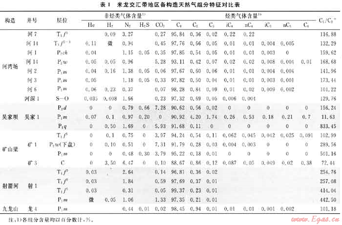 該區(qū)儲層較川西北部地區(qū)取得產(chǎn)能的中三疊統(tǒng)雷口坡組(中壩)和上三疊統(tǒng)須家河組(中壩、九龍山)層位老,埋藏深,從鉆探情況看,下古生界儲層埋深較大,一般在4500m左右。河灣場氣田為多烴源、多儲層、多產(chǎn)層的復(fù)合型氣田[1],前人對其深層天然氣成因和氣源還未做過系統(tǒng)研究。為此,筆者分別根據(jù)天然氣組分、天然氣碳同位素以及天然氣濃縮烴特征來研究該區(qū)各層位深層天然氣氣源。