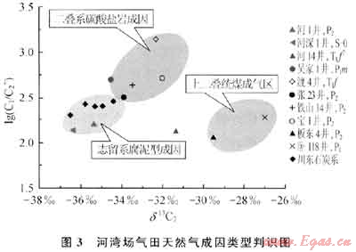 沈平(2005)根據(jù)天然氣乙烷碳同位素特征,將四川盆地海相地層天然氣劃分為3種類型。第一類是δ13C1<-34.0‰,最輕為-37.0‰左右(如福成寨石炭系),川東絕大部分石炭系,尤其是川東北地區(qū)基本屬于這一類。王廷棟等(1994)曾利用儲層瀝青和氣體地球化學(xué)特征綜合判斷為志留系腐泥型烴源巖成因。第二類是δ13C2>-30.0‰,如典型的煤成氣板東4井P22和臥龍河部分下二疊統(tǒng)天然氣,前人研究表明它們主要屬于上二疊統(tǒng)龍?zhí)督M煤系有機質(zhì)成因(楊遠聰?shù)龋?989;王廷棟等,1994;鄭永堅,1995;王蘭生等,1997)。第三類δ13C2介于-34.0‰~-30.0‰,主要分布在川東北二疊系和下三疊統(tǒng)飛仙關(guān)組中,在平面上環(huán)開江-梁平海槽分布或直接分布在開江-梁平海槽中,該類氣體碳同位素組成特征與來源于志留系的腐泥型天然氣和來源于上二疊統(tǒng)龍?zhí)督M煤成氣(腐殖氣)明顯不同。河灣場氣田奧陶系、二疊系地層天然氣δ13C1介于-35.65‰~-35.40‰,δ13C2介于-35.35‰~-36.34‰,乙烷碳同位素明顯低于-34‰,具有典型的腐泥型天然氣特征。與此同時該區(qū)天然氣乙烷碳同位素與川東和川東北地區(qū)二、三疊系天然氣存在明顯的差別,明顯偏輕。河灣場氣田乙烷碳同位素與川東北地區(qū)石炭系天然氣乙烷碳同位素大致相當(dāng)(表2、圖3)。其相同或者相近的乙烷碳同位素特征預(yù)示它們有著相同的來源。