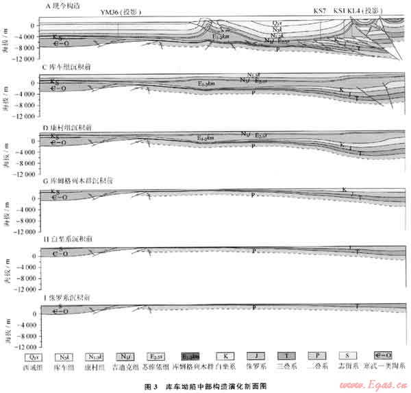 庫車坳陷構(gòu)造變形主要發(fā)生在新近系以后,康村組沉積后構(gòu)造活動(dòng)開始活躍,庫車組中期構(gòu)造活動(dòng)最為強(qiáng)烈,持續(xù)至現(xiàn)今仍在活動(dòng)。古近系沉積前,中生界地層受古隆起構(gòu)造控制,呈現(xiàn)南薄北厚的楔形體,晚白堊世發(fā)生區(qū)域隆升作用,并沒有發(fā)育明顯的斷裂。古近系-新近系康村組沉積前主要是坳陷發(fā)育階段,構(gòu)造活動(dòng)較弱。從圈閉形成與改造角度考慮,庫車坳陷構(gòu)造演化可劃分為以下3個(gè)主要階段(圖3):