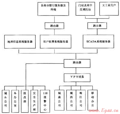 硬件網(wǎng)絡(luò)以地理信息系統(tǒng)服務(wù)器、用戶收費(fèi)系統(tǒng)服務(wù)器和SCAD系統(tǒng)服務(wù)器為核心,采用一條50M和一條8M專用光纜與電信運(yùn)營(yíng)商連接,50M光纜分兩區(qū),其中16M帶寬用于收費(fèi)服務(wù)器與8家聯(lián)網(wǎng)收費(fèi)銀行聯(lián)系傳遞信息,34M帶寬用于辦公網(wǎng)絡(luò)上互聯(lián)網(wǎng)和燃?xì)饩C合管理系統(tǒng)、用戶收費(fèi)系統(tǒng)、SCAD系統(tǒng)通過(guò)VPN設(shè)備與遍布市區(qū)的東南西北四個(gè)分公司及營(yíng)業(yè)服務(wù)廳聯(lián)網(wǎng)。8M光纜專門用于與各SCAD系統(tǒng)遙測(cè)遙控點(diǎn)數(shù)據(jù)傳輸和與集團(tuán)公司SCAD控制中心數(shù)據(jù)交換(通過(guò)互聯(lián)網(wǎng))。