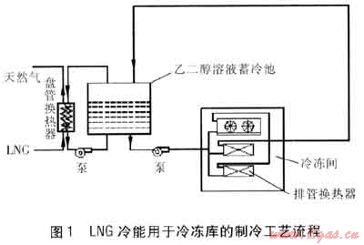 冷凍或冷藏倉庫利用LNG與蓄熱或換熱介質(zhì)進(jìn)行熱交換,利用冷卻介質(zhì)在倉庫內(nèi)循環(huán)冷卻。這種冷卻方式與傳統(tǒng)方式相比,不用大型冷凍機(jī),建設(shè)費(fèi)用少,建設(shè)難度小,電力消耗大幅度下降,節(jié)能效果顯著。