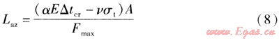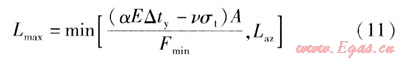 管道循環(huán)溫差位于最大允許循環(huán)溫差和屈服溫差之間,但是由于此時(shí)局部穩(wěn)定控制循環(huán)溫差小于屈服溫差,因此仍不允許進(jìn)入錨固狀態(tài),管道的最大允許安裝長度計(jì)算見式(8)。