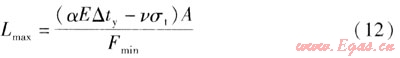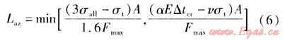在該區(qū)域內(nèi),管道循環(huán)溫差高于最大允許循環(huán)溫差,因此不允許管道進(jìn)入錨固狀態(tài),且在計(jì)算安裝長度時(shí),需考慮彈性狀態(tài)和局部穩(wěn)定的需要,得到管道的最大允許安裝長度,見式(6)。