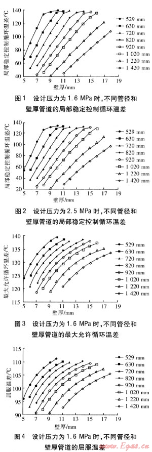 設(shè)計(jì)壓力為1.6MPa和2.5MPa時(shí),不同管徑和壁厚管道的局部穩(wěn)定控制循環(huán)溫差見圖1、2。