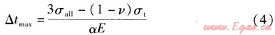 基于安定性分析理論,文獻(xiàn)[3]給出了不同管徑和設(shè)計(jì)壓力下管道的最大允許循環(huán)溫差△tmax與屈服溫差△ty的計(jì)算方法,見式(4)、(5)。這兩種溫差也與管道壁厚密切相關(guān)。設(shè)計(jì)壓力為1.6MPa,不同管徑和壁厚管道的最大允許循環(huán)溫差、屈服溫差分別見圖3、4。