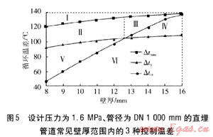 以設(shè)計(jì)壓力為1.6MPa、管徑為DN 1000mm的直埋管道為例,常見壁厚范圍內(nèi)的3種控制溫差見圖5。由圖5可知3種控制溫差的相對(duì)關(guān)系,管道的工作狀態(tài)被劃分為6個(gè)區(qū)域(Ⅰ~Ⅵ區(qū))。本文對(duì)每個(gè)區(qū)域管道的工作狀態(tài)進(jìn)行分析。