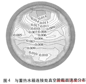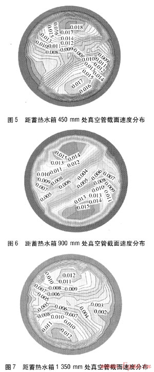 真空管(長(zhǎng)度為1800mm)與蓄熱水箱連接處以及距蓄熱水箱450、900、1350mm處的真空管截面速度分布分別見(jiàn)圖4~7,圖中數(shù)值單位均為m/s。由圖4~7可知,沿著遠(yuǎn)離蓄熱水箱方向,真空管內(nèi)冷熱流體的速度先增大后減小,在距蓄熱水箱450mm處速度最大。說(shuō)明在距蓄熱水箱450mm這段真空管內(nèi)存在冷熱流體的回流混合,造成熱損失,降低了集熱系統(tǒng)的效率,采用引流擋板可以在一定程度上解決該問(wèn)題[11]。