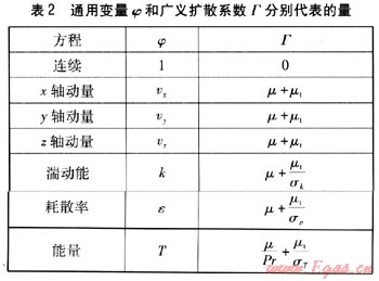 在各個(gè)控制方程中,通用變量φ和廣義擴(kuò)散系數(shù)Γ分別代表的量見(jiàn)表2。