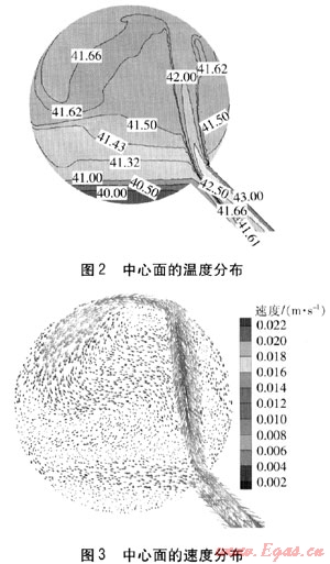 中心面的溫度、速度分布分別見(jiàn)圖2、3,圖2中數(shù)值單位為℃。