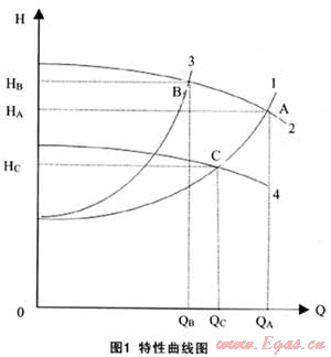 見圖1,當(dāng)閥門全部打開時,供水系統(tǒng)的阻力特性是曲線1;額定轉(zhuǎn)速時,泵的揚(yáng)程特性是曲線2。這時,供水系統(tǒng)的工作點(diǎn)為A點(diǎn);流量為QA;揚(yáng)程為HA;電動機(jī)的軸功率與面積0QAAHA成正比。