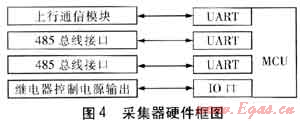 采集器的任務(wù)就是轉(zhuǎn)發(fā)集中器和燃?xì)獗碇g的通信數(shù)據(jù),并在抄讀燃?xì)獗淼臅r(shí)候短暫地給燃?xì)獗淼碾娮硬糠止╇姟2杉骱图衅髦g的通信采用了電力線載波通信方式。電力線載波通信有通信不穩(wěn)定、易受干擾的缺點(diǎn),但采集器只要在軟件上做些改進(jìn)就能極大地彌補(bǔ)這一缺點(diǎn),例如能短時(shí)間地儲(chǔ)存燃?xì)獗淼臄?shù)據(jù)。這樣當(dāng)給集中器返回的燃?xì)獗頂?shù)據(jù)因信道不穩(wěn)定而丟失時(shí),集中器再次下發(fā)抄這塊表的數(shù)據(jù)時(shí),采集器就不用再去抄燃?xì)獗砹耍呛芸斓刂苯臃祷夭杉鲀?chǔ)存的數(shù)據(jù),這樣就使抄表成功率大大提高。采集器也要求采用可更換的通信模塊,儲(chǔ)存容量不需要太大,采集器MCU要有至少3個(gè)UART,還要有給燃?xì)獗砉╇妴卧?。采集器的硬件框圖見圖4。MCU的1個(gè)UART和上行通信模塊相連,2個(gè)UART設(shè)計(jì)成RS485總線。這2個(gè)RS485接口,1個(gè)是和燃?xì)獗硗ㄐ庞茫?個(gè)保留和集中器通信。如果采集器和集中器距離很近,就用保留的RS485接口直接和集中器相連。同時(shí)MCU控制1個(gè)繼電器給直讀式燃?xì)獗淼碾娮硬糠止╇姟?/span>