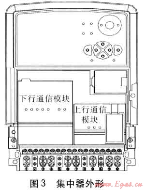 集中器外殼選用國家電網(wǎng)公司企業(yè)標(biāo)準(zhǔn)Q/GDW 375.2—2009《電力用戶用電信息采集系統(tǒng)型式規(guī)范:集中器型式規(guī)范》中的集中器外殼。外形見圖3??梢钥吹?,這個(gè)外殼上面有上行通信模塊和下行通信模塊兩個(gè)小盒子,這兩個(gè)小盒子采用了可插拔設(shè)計(jì)。左邊小盒子是和采集器通信的通信模塊,右邊小盒子是和主站通信的通信模塊。集中器在設(shè)計(jì)時(shí)先規(guī)定好集中器和這兩個(gè)通信模塊之間的通信協(xié)議和物理層的接口,所有通信模塊的設(shè)計(jì)都遵守這個(gè)協(xié)議。根據(jù)現(xiàn)場選擇通信方式的不同更換不同的通信模塊,這樣就大大提高產(chǎn)品的適應(yīng)能力。