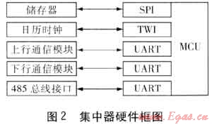 集中器的任務(wù)較多,主站抄讀實(shí)時(shí)數(shù)據(jù)時(shí)也要求集中器有一定的實(shí)時(shí)性要求,這就要求集中器中的微處理器(MCU)有較高的運(yùn)算速率。集中器的通信接口較多,要求集中器至少有3個(gè)通用異步串行接口(UART):1個(gè)UART和上行通信模塊通信,1個(gè)UART和下行通信模塊通信,另1個(gè)UART設(shè)計(jì)成RS485接口,這個(gè)RS485接口主要用于當(dāng)集中器和采集器距離很近時(shí),集中器直接通過這個(gè)RS485接口和采集器直接通信,而不需要通過下行通信模塊了。集中器內(nèi)選擇同步串行接口(SPI)的儲(chǔ)存器,它具有接線少、儲(chǔ)存量大的優(yōu)點(diǎn)。MCU需要有至少1個(gè)SPI接口。集中器做日凍結(jié)數(shù)據(jù)和月凍結(jié)數(shù)據(jù)時(shí)所需要的日歷時(shí)鐘大多采用兩線制串行接口(TWI),這就需要MCU要有TWI接口。隨著電子技術(shù)和計(jì)算機(jī)通信技術(shù)的發(fā)展,能實(shí)現(xiàn)這樣功能的MCU有很多。集中器設(shè)計(jì)時(shí)還要內(nèi)置防雷器件。集中器硬件框圖見圖2。