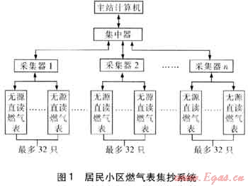 居民小區(qū)燃?xì)獗砑到y(tǒng)見圖1。系統(tǒng)由3部分組成,即燃?xì)獗?、集抄設(shè)備和主站。與傳統(tǒng)方式不同的是集抄設(shè)備不再是集中器一種設(shè)備,而是由集中器和采集器組成。集中器每天或每月輪抄1遍所轄的燃?xì)獗?,這個(gè)過程需要通過采集器轉(zhuǎn)發(fā)配合完成。集中器把數(shù)據(jù)保存在儲(chǔ)存器中然后等待主站發(fā)命令讀取。主站每天或每月定時(shí)讀取集中器內(nèi)的數(shù)據(jù),也可以通過集中器和采集器實(shí)時(shí)地讀取燃?xì)獗淼臄?shù)據(jù)。這個(gè)系統(tǒng)中燃?xì)獗磉x用無源直讀燃?xì)獗怼?/span>