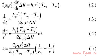 由以上分析可知,首先在液-液分界面處形成一個(gè)球形水合物膜層,水和客體物質(zhì)分別通過(guò)水合物膜層向兩側(cè)擴(kuò)散以便相互接觸,促進(jìn)水合物的生長(zhǎng)。假設(shè)此時(shí)水合物向兩側(cè)的生長(zhǎng)率相同,即rh=r0+dr,rb=r0-dr,當(dāng)t=0時(shí),r=r0,則由式(1)得到式(2)~(5)。