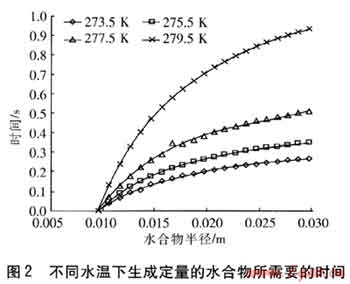 從圖2可以看出:溫度越低,生成相同量的水合物所需的時(shí)間越短。水合物半徑越大,半徑的增長(zhǎng)速度越快。分析可知這是由于水合物沿半徑方向生長(zhǎng),水合物膜的表面積增大,生成水合物產(chǎn)生的熱量排放比較快,從而導(dǎo)致過(guò)冷度增大,使水合物的生長(zhǎng)率增大。在273.5~277.5K內(nèi),相同量水合物的生成時(shí)間差別較小,而大于277.5K時(shí),生成相同量的水合物所需時(shí)間要長(zhǎng)得多,即在一定溫度范圍內(nèi),水合物的生成速率基本相同。對(duì)于制冷劑HCFC-141b而言,273.5~277.5K為水合物生長(zhǎng)的最優(yōu)溫度,水合物在制備過(guò)程中需要外界提供能量以保證水合物生長(zhǎng)的環(huán)境溫度,通過(guò)計(jì)算可以得到最優(yōu)溫度,有利于節(jié)約能源。