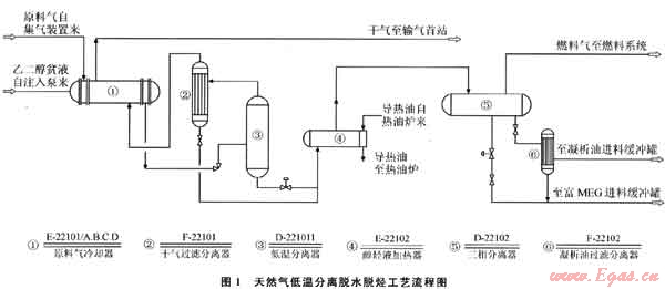 某含汞氣田天然氣處理廠采用節(jié)流制冷低溫分離脫水脫烴、注乙二醇防止水合物的處理工藝,主要工藝單元包括脫水脫烴單元、乙二醇再生單元及凝析油穩(wěn)定單元[7]。脫水脫烴單元的工藝流程如圖1所示,自集氣裝置來的原料天然氣,從上部進(jìn)入原料氣預(yù)冷器(E-22101)。自乙二醇再生及注醇裝置來的乙二醇貧液通過霧化噴頭霧化,噴射入原料氣預(yù)冷器,和原料氣在管程中充分混合接觸后,與白干氣過濾分離器(F-22101)來的冷干氣進(jìn)行換熱,被冷卻至-5℃左右。原料天然氣再經(jīng)J-T閥作等焓膨脹,氣壓降至6.4MPa,溫度降至-30℃左右,再從中部進(jìn)入低溫分離器(D-22101)進(jìn)行分離,分離出液態(tài)含醇液和凝析油。干氣進(jìn)入干氣過濾分離器(F-22101)進(jìn)一步分離出夾帶的少量的含醇液和凝析油,再進(jìn)入E-22101殼程與原料天然氣逆流換熱,換熱后的干氣輸送至增壓站。
