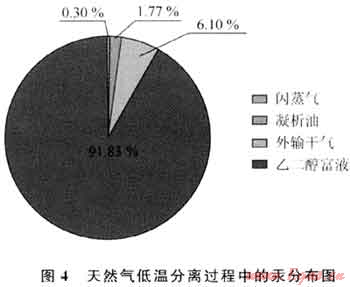 為了定量分析含汞天然氣低溫分離過程中汞的分布規(guī)律,以原料氣汞含量為100μg/m3為例,利用VMGSim軟件對(duì)天然氣脫水脫烴工藝流程進(jìn)行模擬,其關(guān)鍵物流點(diǎn)的汞濃度見表2。根據(jù)模擬結(jié)果,可計(jì)算出標(biāo)準(zhǔn)狀態(tài)下(20℃,101.325kPa)閃蒸氣、未穩(wěn)定凝析油、乙二醇富液和外輸干氣中的汞濃度分別為1960.43μg/m3、80.77μg/L、4.69mg/L和6.11μg/m3。原料氣中的汞在各物流中的分布情況如圖4所示。由圖4可知,含汞天然氣經(jīng)過低溫分離后,原料氣中91.83%(質(zhì)量分?jǐn)?shù))的汞進(jìn)入了乙二醇富液中,6.10%(質(zhì)量分?jǐn)?shù))的汞進(jìn)入了外輸干氣中,1.77%(質(zhì)量分?jǐn)?shù))的汞進(jìn)入了未穩(wěn)定的凝析油中,剩余0.30%(質(zhì)量分?jǐn)?shù))的汞進(jìn)入了三相分離器閃蒸氣中。