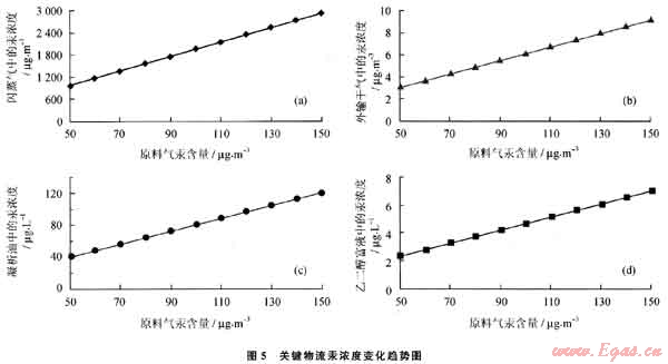 3) 乙二醇富液、外輸干氣、凝析油和閃蒸氣中的汞含量隨著原料氣中汞含量的增加而增加,其趨勢(shì)依次減弱,乙二醇富液中汞含量增加的趨勢(shì)最顯著,閃蒸氣中汞含量增加的趨勢(shì)最弱。