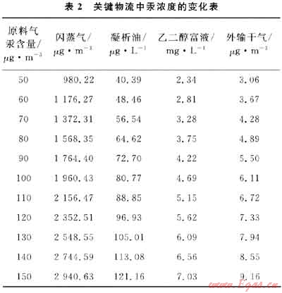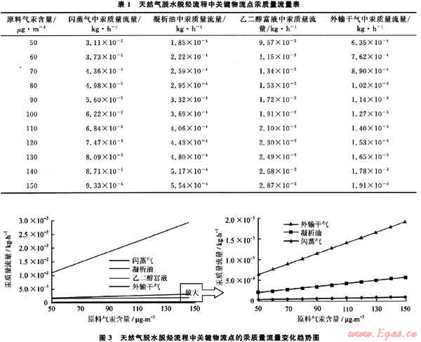 2) 含汞天然氣經(jīng)過低溫分離后,絕大多數(shù)汞進(jìn)入了乙二醇富液,經(jīng)乙二醇再生后進(jìn)入再生塔塔頂未凝氣及污水中;少數(shù)汞進(jìn)入了外輸干氣中;極少數(shù)汞進(jìn)入了三相分離器閃蒸氣相、未穩(wěn)定的凝析油和乙二醇貧液中。