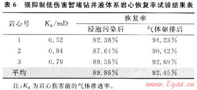 為驗證現(xiàn)場完井液對儲層的傷害程度,模擬現(xiàn)場實際鉆井過程,測定鄰井的3塊巖心經48h動態(tài)、48h靜態(tài)傷害前后及高壓氣體反向驅排后的滲透率并計算巖心的恢復率(表6)。