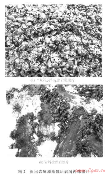 1) 鉀鹽聚磺鉆井液體系具有良好的抑制防塌性能。在斜井段施工過程中,該鉆井液體系從鉀離子的防塌性、無機鹽降低水相滲透壓、聚磺的抑制封堵等3個方面增強了鉆井液體系的抑制防塌能力,返出“雙石層”巖屑形狀規(guī)則,沒有出現(xiàn)水化或分散跡象,捻碎后巖屑內部呈干態(tài),有效防止了PDC鉆頭泥包(圖2)。