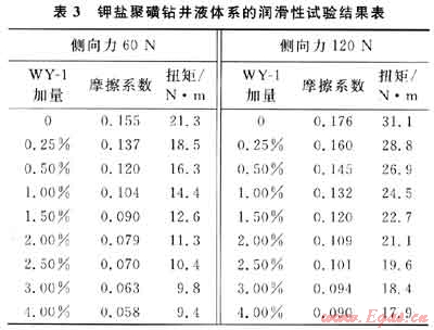采用上述鉆井液配方,改變潤滑劑WY-1的加量,借助DA-11動態(tài)模擬潤滑儀測其在不同側向力條件下的摩擦系數(shù)和扭矩,觀察在不同側向力下體系的潤滑性能,結果見表3。