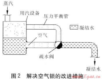 當(dāng)疏水閥內(nèi)不凝氣體不能及時排出,即發(fā)生空氣鎖。對于安裝了沒有足夠排氣能力的圓盤式或倒吊桶式疏水閥的疏水系統(tǒng),在用汽設(shè)備啟動時大量的空氣被凝結(jié)水鎖閉在疏水閥內(nèi),從而導(dǎo)致空氣鎖出現(xiàn)。對于空氣鎖,可通過在疏水閥體與用汽設(shè)備間安裝一條壓力平衡管來解決。
