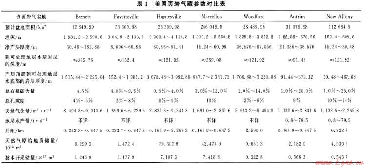 目前發(fā)現(xiàn)的頁巖氣藏主要穿過了南部的48個州(除阿拉斯加和夏威夷外),最活躍的頁巖氣藏是Barnett、Haynesville、Marcellus、Antrim、Eagle Ford和New Albany等氣藏。表1總結(jié)了美國優(yōu)選頁巖氣藏的地質(zhì)參數(shù)。表2不僅提供了頁巖氣儲層的地質(zhì)參數(shù),而且給出了通過對比某些關鍵參數(shù)評估頁巖氣盆地的方法。這些參數(shù)也應用在頁巖氣井的完井設計中。