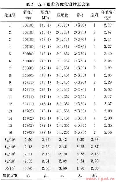由模型可知,在輸量及輸送距離已定的條件下,長(zhǎng)距離輸氣管道的可行管徑、壓力、鋼材級(jí)別、壓氣站數(shù)(壓氣站間距、壓縮比)與長(zhǎng)距離輸氣管道的營運(yùn)成本間的關(guān)系是復(fù)雜、甚至是難以辨析清楚的。由于工程技術(shù)條件所限定,上述各變量又皆為離散可列的,所以,在選定管道年值費(fèi)用作為取舍標(biāo)準(zhǔn)后,采用正交試驗(yàn)設(shè)計(jì)方法,科學(xué)安排各經(jīng)濟(jì)參數(shù)的方案組合,能用較少的試驗(yàn)次數(shù)找出最優(yōu)的方案。
