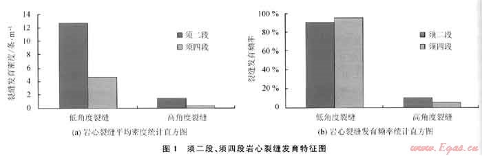 1) 無論是巖心尺度的裂縫還是薄片尺度的裂縫,須二段均比須四段更為發(fā)育。據(jù)巖心觀察和統(tǒng)計,低角度裂縫比高角度裂縫更為發(fā)育,前者的密度大致是后者的10倍。