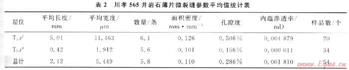 為了說明薄片裂縫的分布特征,尤其是須二段和須四段裂縫發(fā)育和分布的差異性,選取裂縫較為發(fā)育的川孝565井,對薄片中裂縫進行了系統(tǒng)鑒定和統(tǒng)計,據(jù)Cmexoba等于1962年提出的薄片微裂縫各項指標的計算公式[18],計算微裂縫的各項特征參數(shù)并求取平均值(表2)。