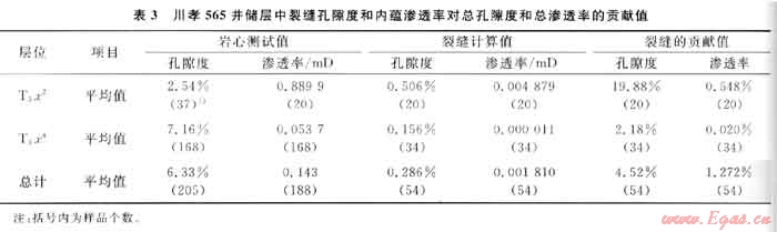 據(jù)川孝565井須二、須四段巖心孔隙度和滲透率的分析結(jié)果,可估算裂縫孔隙度和內(nèi)蘊滲透率對總孔隙度和總滲透率的貢獻值(表3)。