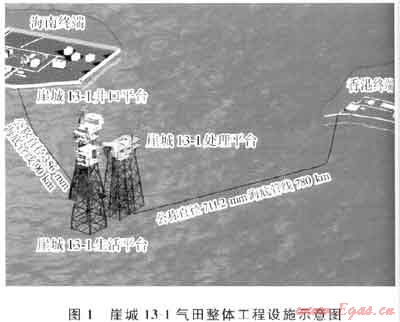 崖城13-1氣田大部分天然氣經(jīng)脫水和烴露點(diǎn)處理后,經(jīng)一條公稱(chēng)直徑711.2mm長(zhǎng)780km的海底管線輸送到香港特別行政區(qū)用于發(fā)電,小部分天然氣和全部凝析油經(jīng)一條公稱(chēng)直徑356mm長(zhǎng)90km的海底管線送往海南省南山終端處理和銷(xiāo)售。