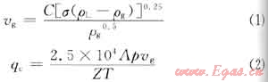 式中vg為氣體帶水最小卸載流速,m/s;C為Turner系數(shù),C=2.04;σ為液滴表面張力,N/m;ρL為液體的密度,kg/m3;ρg為氣體的密度,kg/m3;qc為最低攜液產氣量,104m3/d;A為油管橫截面積,m2;p為壓力,MPa;Z為天然氣壓縮因子;T為井底溫度,K。