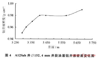 根據(jù)各井儲層孔隙壓力情況及安全鉆井密度窗口,選擇密度合適的VERSACLEAN油基鉆井液。以A12Sah井為例,該井儲層段采用密度為0.95g/cm3高油水比油基鉆井液開鉆,隨著現(xiàn)場鉆井過程中屏蔽暫堵材料的不斷補(bǔ)充及鉆屑固相含量的增加,至該井段完鉆時(shí)鉆井液密度為0.99g/cm3(圖4)。