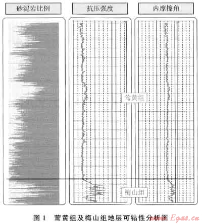 Φ311.15mm井段面臨著井段長、作業(yè)時(shí)間長、地層跨度大、下部層位石灰質(zhì)含量高、二次造斜等諸多挑戰(zhàn),鉆頭選型是否合理,關(guān)系到整口井的時(shí)效高低。本井段穿越鶯黃組下部、梅山組、三亞組(部分井缺失)地層,鶯黃組下部地層較為均質(zhì),地層抗壓強(qiáng)度介于34.5~55.2MPa,內(nèi)摩擦角在35°以下,具有較好的可鉆性;梅山組地層埋深大,地層抗壓強(qiáng)度介于55.2~103.4MPa,部分層位石灰質(zhì)含量高,內(nèi)摩擦角介于36°~40°,對鉆頭的抗沖擊性及抗研磨性具有較高的要求(圖1)。