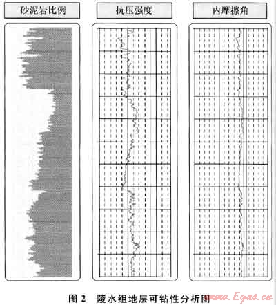 結(jié)合實(shí)際生產(chǎn)數(shù)據(jù)及油氣藏?cái)?shù)值模擬,研究該氣田開采后期儲層孔隙壓力的衰減變化規(guī)律,通過室內(nèi)試驗(yàn)測定崖城13-1氣田地層力學(xué)特性及強(qiáng)度特征(圖3),以及測井資料的分析處理,建立該氣田測井資料求取地層強(qiáng)度的經(jīng)驗(yàn)?zāi)P?;利用多孔彈性介質(zhì)力學(xué)、巖石力學(xué)理論,建立井壁坍塌壓力及破裂壓力的計(jì)算模式,得出預(yù)鉆調(diào)整井地層孔隙壓力、坍塌壓力及破裂壓力剖面,為確定合理鉆井液密度及優(yōu)化井身結(jié)構(gòu)提供科學(xué)依據(jù)。
