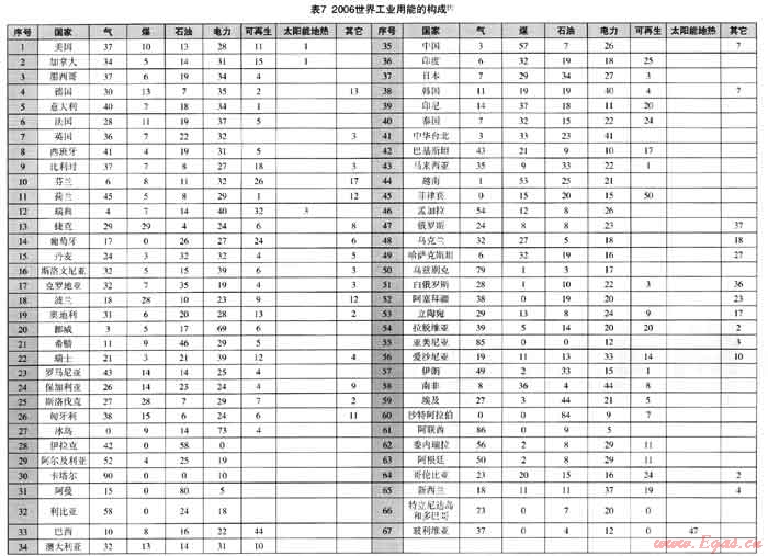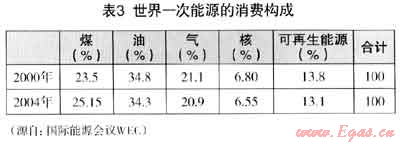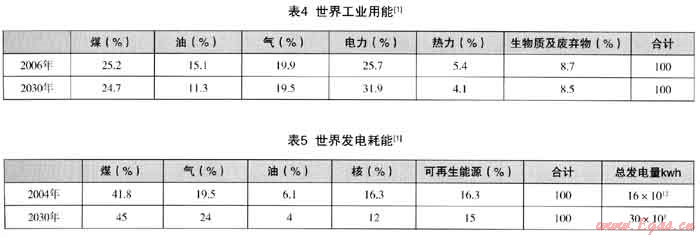 (1) 世界一次能源的消費(fèi)構(gòu)成、世界工業(yè)用能構(gòu)成和世界發(fā)電用能構(gòu)成可見(jiàn)表3、表4、表5