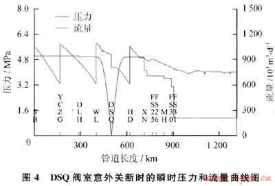 輸氣管道干線截?cái)嚅y(DSQ閥室)意外關(guān)斷時(shí),管道的瞬時(shí)壓力和流量趨勢(shì)如圖4所示。從圖4可以看出,DSQ閥室意外關(guān)斷后,該閥室的天然氣通過(guò)量瞬間下降至零,上下游的流量下降均較快,入站壓力上升,出站壓力下降。長(zhǎng)此以往將影響到上游壓縮機(jī)的運(yùn)行、下游用戶的分輸量以及全線的輸氣量,最后導(dǎo)致全線停運(yùn)。