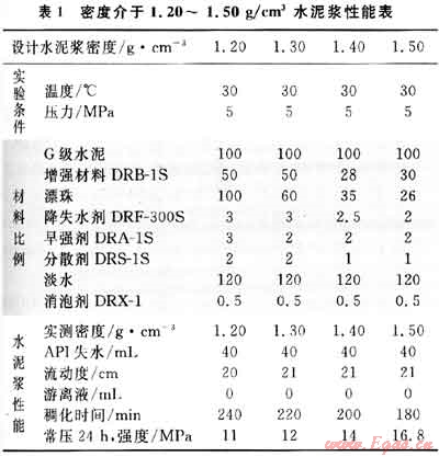 1) 1.20g/cm3:水泥100+DRB-1S 50+漂珠100+降失水劑DRF-300S 3+早強(qiáng)劑DRA-1S 3+分散劑DRS-1S 2+消泡劑DRX-1 0.5+水120。
