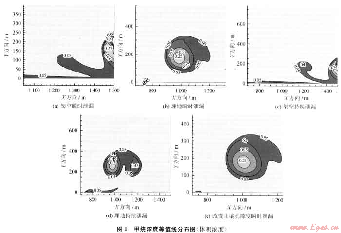 圖1為泄漏80s后甲烷濃度等值線分布。由圖可知:架空瞬時泄漏甲烷分布高濃度區(qū)擴散至(1450m,200m)高空,分布不規(guī)則;埋地瞬時泄漏則分布在(1000m,150m)高空,呈圓形區(qū)域,在泄漏口有小范圍高濃度區(qū)。架空持續(xù)泄漏與架空瞬時泄漏分布曲線相似,但持續(xù)泄漏高濃度區(qū)向右下偏移。埋地持續(xù)濃度分布呈對稱結(jié)構(gòu),高濃度區(qū)內(nèi)存在左、右2個高濃度區(qū),近地面存在長250m、高20m的扁長狀爆炸區(qū)。增大土壤孔隙度后近地面無爆炸危險,濃度分布與埋地瞬時相似,但濃度降低。