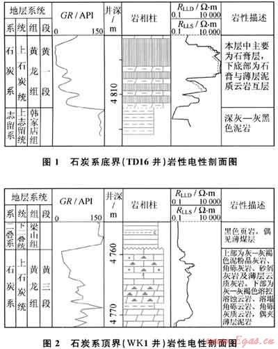 二疊系與石炭系在巖性及電測曲線上均易于劃分。其上下地層的巖性和電性差異較為明顯。從巖性上看,梁山組底部以黑色頁巖夾薄煤層,局部頁巖含硅質(zhì),與下伏C2hl灰褐色泥粉晶灰?guī)r呈角度不整合接觸。從電性上看,梁山組對應(yīng)的測井曲線反映為GR值較高,RLLD和RLLS值較低(圖2)。
