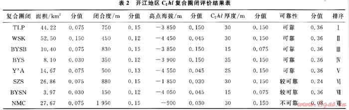 C2hl及其上、下巖層的組合是四川盆地多套生、儲蓋組合中較好的一套組合,經(jīng)過多年的勘探也證實(shí)C2hl具有豐富的天然氣資源。結(jié)合已發(fā)現(xiàn)C2hl氣藏特征對已識別C2hl復(fù)合圈閉面積進(jìn)行劃分,圈閉面積小于10km2的權(quán)值取0.2,圈閉面積大于50km2的取權(quán)值1.0,圈閉面積介于10~50km2的取權(quán)值0.5,圈閉面積評價系數(shù)權(quán)重為O.15(表1)。