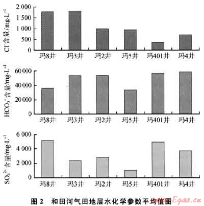 統(tǒng)計分析結(jié)果表明,井間地層水的化學特征也存在較大的差異(圖2)。地層水在西部的瑪8、瑪3井明顯富含HC03-,可能與西部保存條件相對較差有關(guān)。東部的瑪4等井HC03-的含量明顯偏低。Cl-、S042-含量等參數(shù)在井間變化大,無規(guī)律性,說明井間的地層水連通性差,不是統(tǒng)一的連通底水。在同一口井縱向上水性也有差異,而且沒有明顯的變化趨勢,瑪8井古潛山頂面HC03-含量較高,Cl-濃度低,其他參數(shù)縱向上也有變化?,?井地層水各項參數(shù)隨深度變化也有差異,可能預示縱向上不同儲層段連通性差,不同層段地層水有分隔??傮w而言,該區(qū)地層水的Cl-、HC03-、S042-含量等參數(shù)在平面上與縱向上都有較大的變化,沒有統(tǒng)一的塊狀底水。